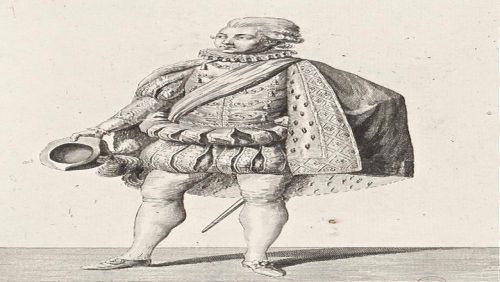 Gravure représentant le Comte Almaviva vêtu d’un costume d’époque baroque